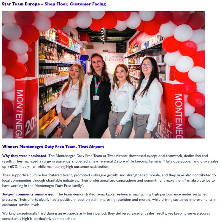 These recognitions underline Montenegro Duty Free’s commitment to excellence, innovation, and teamwork, as well as the dedication of its employees who contribute to delivering outstanding results and customer experiences.